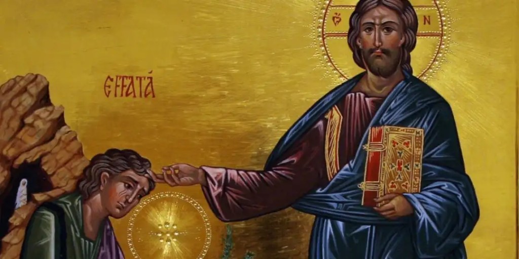 In the Gospel, Jesus says Ephphatha to open the ear of the deaf man. Leading up to this, we hear the account with detail, “He put his finger into the man’s ears and, spitting, touched his tongue; then he looked up to heaven and groaned” (7:33-34). In Jesus’ world, people thought that saliva had medicinal properties. By spitting, Jesus enters the world of the deaf man, his culture, his worldview to communicate his healing power. Jesus touches his tongue, again a non-verbal act of demonstrating his healing authority. The groaning of Jesus can also be translated as a sigh or a moan. The same word is found in Paul’s description of how the spirit groans in his intercession (Romans 8:26). This groaning is an expression of Jesus praying from the depth of his prayer to restore this man to his original state.