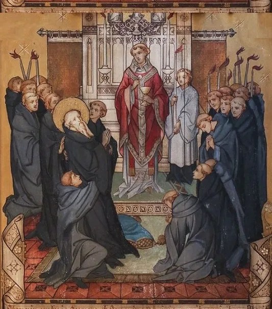 “Six days before he died, he gave orders for his tomb to be opened. Almost immediately, he was seized with a violent fever that rapidly wasted his remaining energy. Each day his condition grew worse until finally, on the sixth day, he had his disciples carry him into the chapel where he received the Body and Blood of our Lord to gain strength for his approaching end. Then, supporting his weakened body on the arms of his brethren, he stood with his hands raised to heaven and, as he prayed, breathed his last (St. Gregory, Book Two of Dialogues, Chapter 37).
