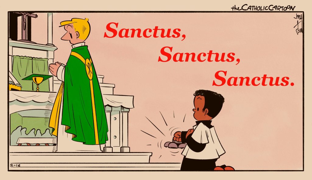 a) The thanksgiving. The priest takes our words “right and fitting” and poetically continues in the preface. Preface is not an introduction as we commonly understand it. It comes from the Latin prae fari which translates to do in front of or proclaim in the presence of. It is a proclamation of the thanksgiving. We are giving thanks to the Father. The expression Through Christ our Lord is uttered to articulate the Son’s great deed that won our salvation. The preface concludes thrusting us into the presence of all the angels to utter an acclamation.
