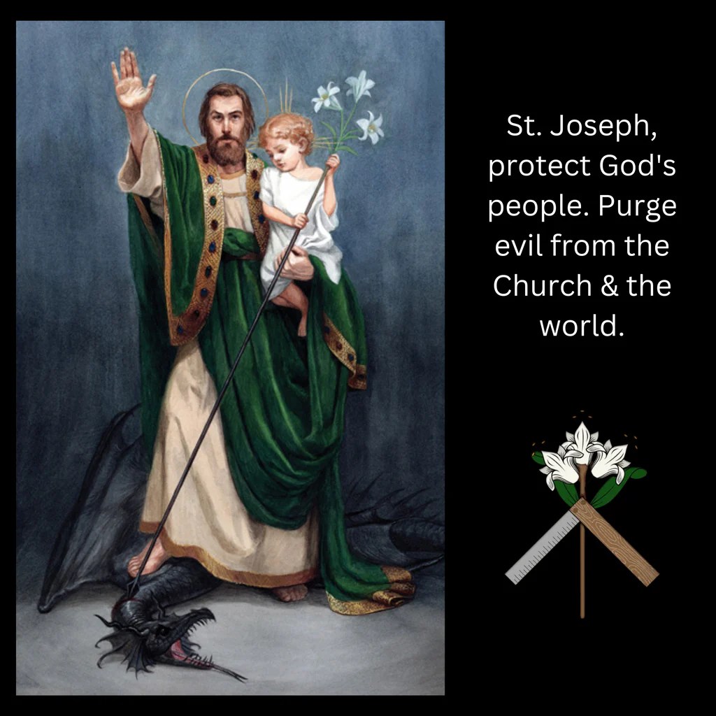 I love this image of Saint Joseph and the child. His commanding right hand conveys his silence, his mouth closed. The infant Jesus takes the spear from Joseph’s lily, a sign of Joseph’s purity, and punctures the neck of the dragon. Christ is the one fighting our battles with Joseph as our companion.