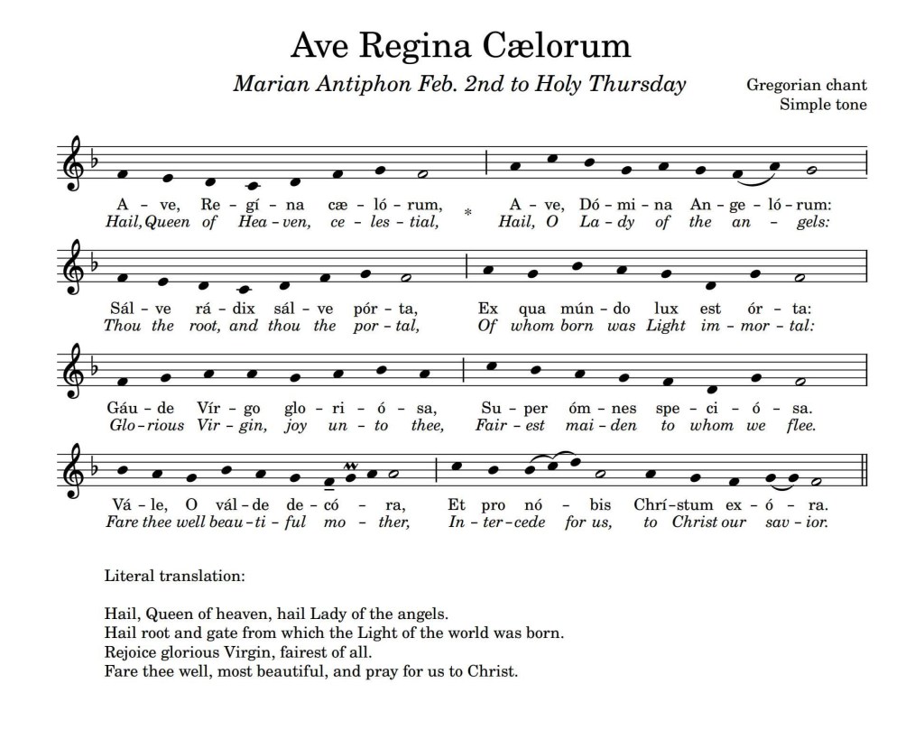 Tonight, we begin the Ave Regina Caelorum. This hymn was integrated into the Divine Office by Pope Clement VI in the fourteenth century and is sung from February 3 until the Easter Vigil.