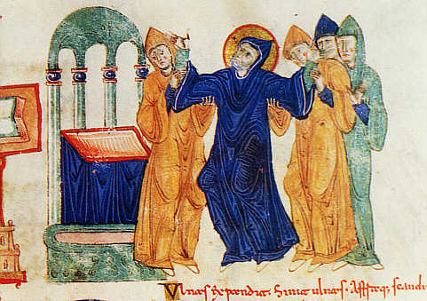 Six days before his death, he commanded that his grave be opened. Soon he was seized with fever, and he was exhausted by its burning heat. He became weaker as the days went by, and on the sixth day he had his disciples carry him into the oratory. There he fortified himself for death by receiving the Body and Blood of the Lord. Then, with his weak body held up by his disciples, he stood with his hands raised toward heaven and breathed forth his last as he prayed (Chapter 37.2).